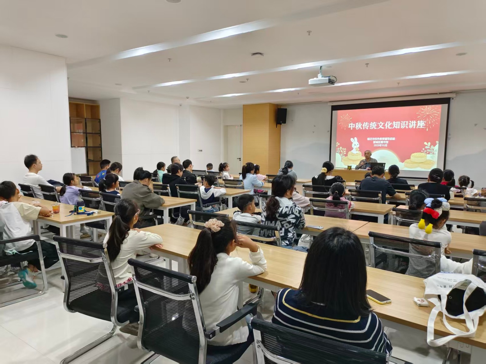 活动分两个阶段进行。首先,宿迁市校外教育辅导总站办公室主任、宿豫区中国历史文化研究会副秘书长吴良秀为参加活动的孩子们及家长开设了一场“中秋传统文化知识”专题讲座,他系统概括了中秋节的起源、发展与核心文化内涵,绘声绘色讲述了《嫦娥奔月》《玉兔捣药》等神话传说故事,同时介绍中秋节人们摆香案祈求平安,吃月饼祈求家人团圆,在院落内摆上苹果、香蕉等水果赏月,文人吟诗作对思念远方亲友,扎灯笼猜谜语等传统习俗,引导参与者深入理解中秋节传统文化的丰富内涵以及在当代社会文明时期的价值体现;其次,苏工苏作馆吴艳老师指导参与者亲子互动制作织锦灯笼,为家长和孩子提供交流、融合平台,体验劳动创作的开心快乐,他们制作灯笼作品可点亮带回家,既作为节日装饰,亦承载对团圆美满的祈愿。
