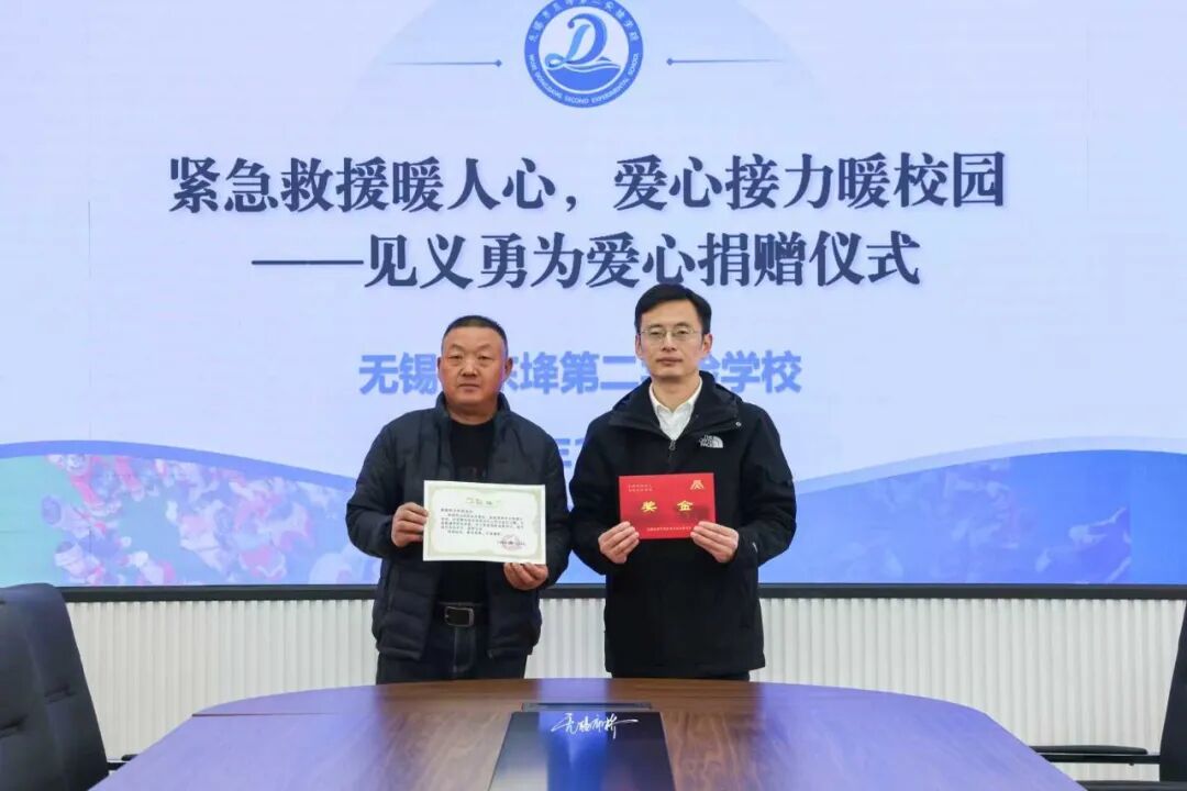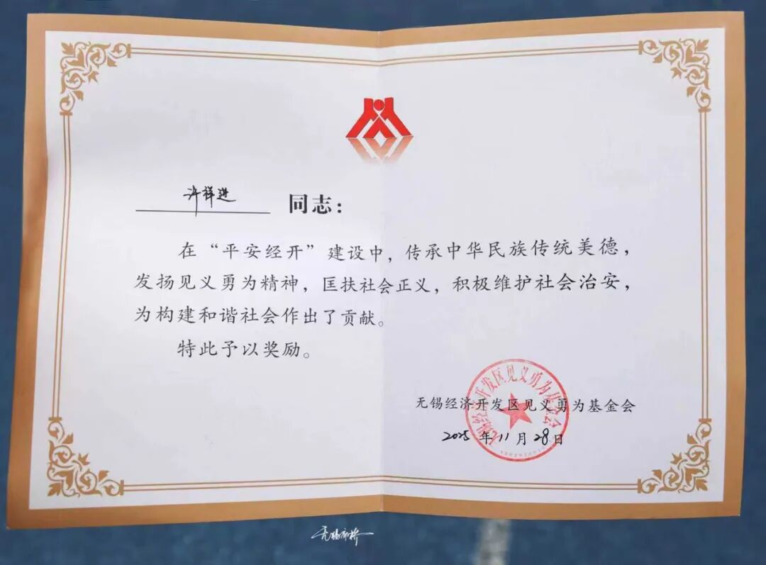 12月1日,许祥进被无锡经开区见义勇为基金会授予见义勇为荣誉证书及奖金,表彰其在危急时刻挺身而出、科学施救的英勇行为。获得表彰后,许祥进当即决定将奖金捐赠女儿就读的东鿍第二实验学校,他表示,这份奖励源于一份爱心,希望它能传递出去,温暖更多需要帮助的孩子。