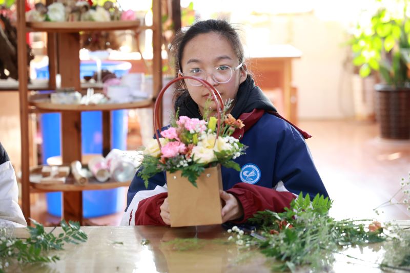 花艺课上,一花一叶皆成诗。在专业教师的示范下,同学们学习花材识别、色彩搭配与造型构思。修剪枝叶、调整层次、点缀配叶……一双双略显生疏的手,逐渐在花泥上勾勒出属于自己的风景。烹饪课中,一揉一烤见匠心。从称量材料、揉制面团,到造型点缀、入箱烘烤,同学们在老师的指导下,亲手完成了一道道精巧的中西式点心。劳动的真实感与食物的温度,在这一刻沁入心间。两小时的课程虽短,却是一次生动的“职业启蒙”。学生们在实践中体会到:技能并非遥远的概念,而是融入生活、可触可感的创造力量。活动不仅锻炼了动手能力,更在潜移默化中传递着“劳动光荣、技能宝贵”的价值观念。