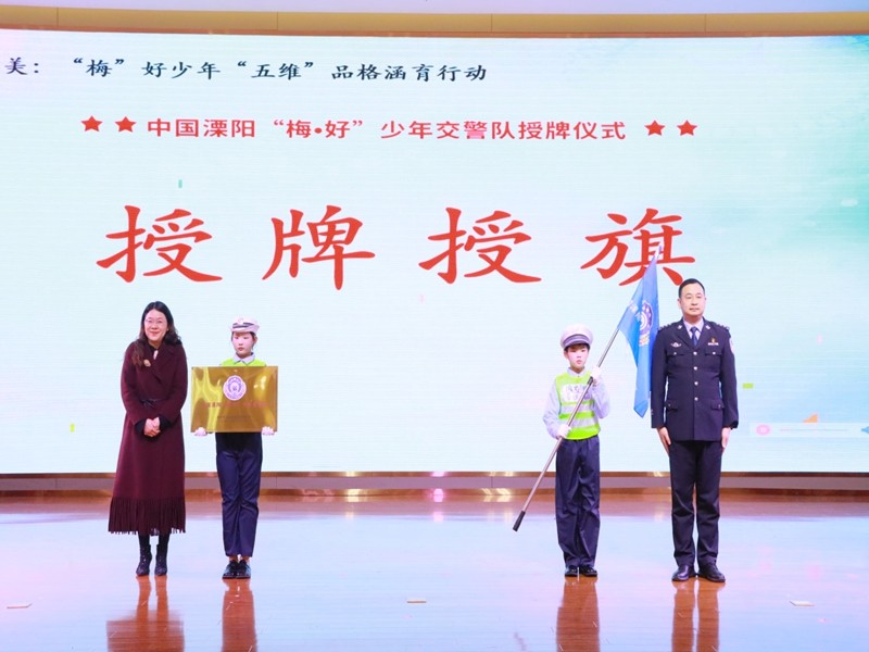 冬日暖阳映照梅枝,少年执礼开启新程。1月8日,溧阳市梅园小学报告厅内掌声阵阵,中国溧阳“梅・好”少年交警队授牌仪式在此隆重举行,这是溧阳市首支由小学生组成的少年交警队。溧阳市公安局副局长李晓敏、市教育局副局长崔恩,市公安局交通管理大队大队长史建刚、市教育局德育科科长史兰萍,江苏理工学院体育学院副院长张文贤,外国语小学教育集团陆丽萍总校长以及市交警代表、梅园小学学区社区代表、学校师生及家长代表齐聚一堂,共同见证这支少年队伍肩负交通安全使命正式启航。