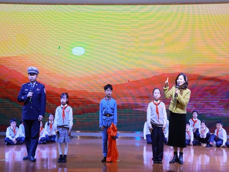 “成长”篇章中,现场播放了少年交警上岗执勤、少年交警说交通的视频,四位队员上台宣讲交通安全知识,向大家普及 “一盔一带” 的重要性。史建刚和史兰萍为“梅・好”少年交警队授旗授牌。全体少年交警队员庄严宣誓,铿锵誓言彰显着守护交通安全的坚定决心。