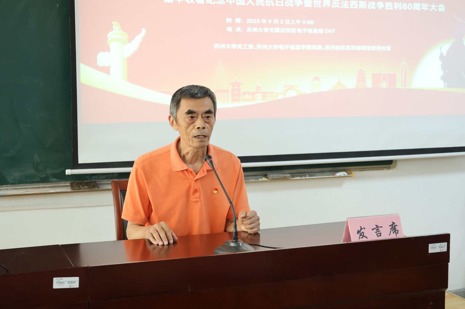 在纪念中国人民抗日战争暨世界反法西斯战争胜利80周年,苏州大学关工委充分发挥“五老”优势,联合电子信息学院党委、姑苏区双塔街道杏林社区,共同举办“共瞻阅兵盛典 培育时代新人”主题教育活动,通过"观、讲、学"三维联动,引导青年师生赓续红色血脉。校关工委常务副主任陈一星、秘书长陈平、电子信息学院全体领导班子成员出席活动。