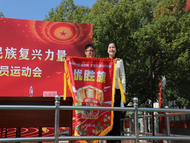 闭幕式上,志愿者整理赛场、协助统计积分,陆丽萍校长为优胜队授旗。她在致辞中强调,全员运动会以“人人参与、个个会运动”为宗旨,融国防教育与体育竞技于一体,拼搏与协作尽显风采,体育精神永不落幕,未来将持续推动运动成为习惯,以健康护佑成长。随后,全场共唱《歌唱祖国》,运动会圆满落幕。
