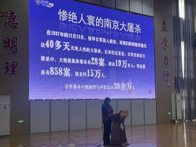 “紫金草行动”志愿宣讲团成员三位老师以震撼人心的防空警报声音导入,瞬间将现场氛围带入历史情境。他们通过互动提问、播放历史纪录片等生动形式,向学生们详细讲述侵华日军南京大屠杀的惨痛史实,系统普及国家公祭日的由来与核心意义。一组组触目惊心的史实数据、一个个感人至深的历史片段,让同学们直观感受到战争的残酷无情,深刻体会到今日和平生活的来之不易。