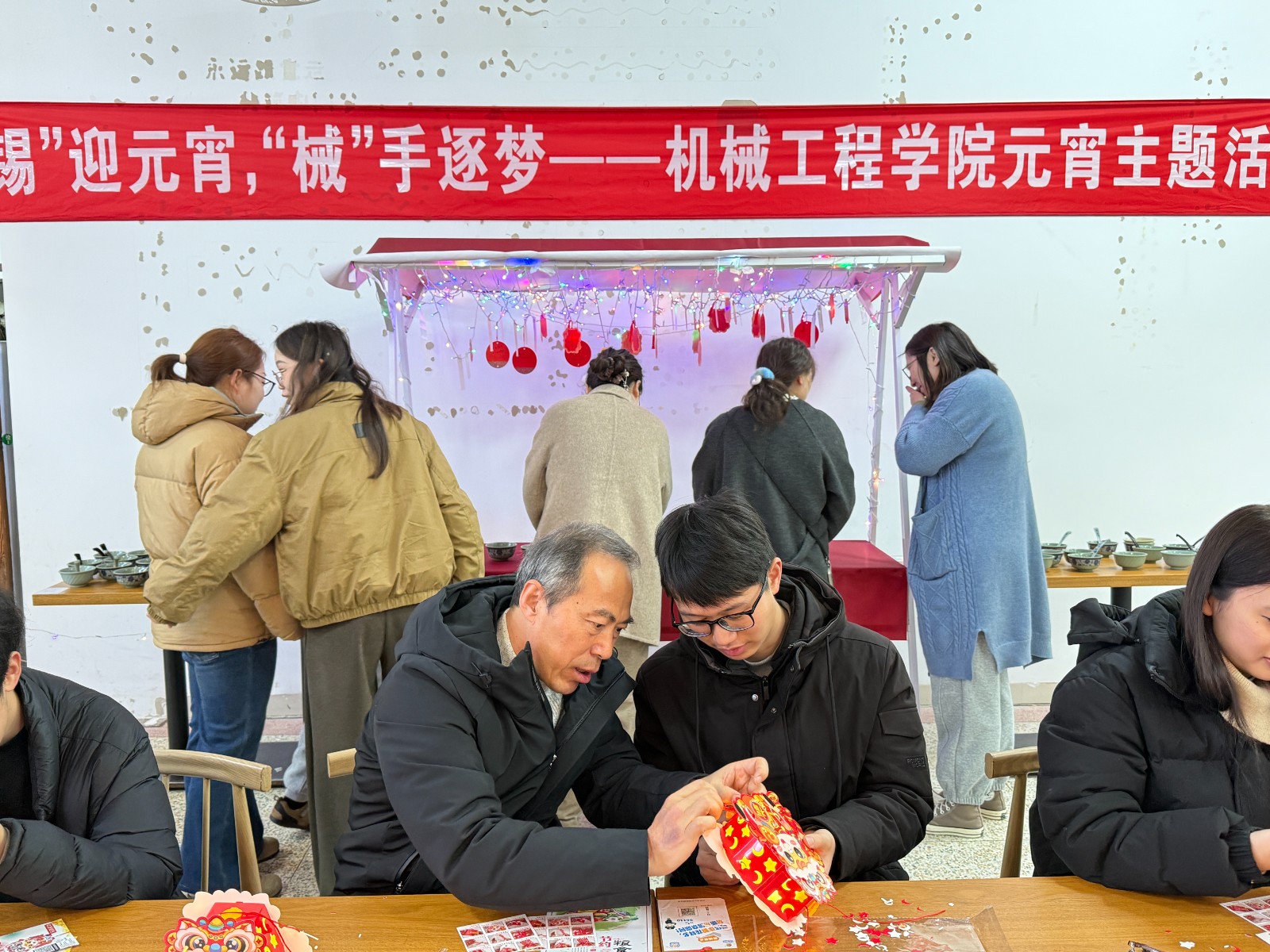 讲解结束后,各项体验活动有序开展。暖心汤圆会环节,师生同聚一堂、共品无锡特色汤圆;匠心花灯DIY环节,同学们巧手创作、精心制作,将无锡灯俗特色与机械专业元素融入花灯设计,以美育熏陶、劳育实践诠释精益求精的工匠精神。江铭主任也不时驻足指导,鼓励同学们将匠心与文脉融入每一个细节。“机械+民俗+思政”多主题灯谜妙趣横生,既涵盖机械专业知识、无锡民俗常识,又融入思政热点,以智育赋能激发专业学习热情与文化认同。