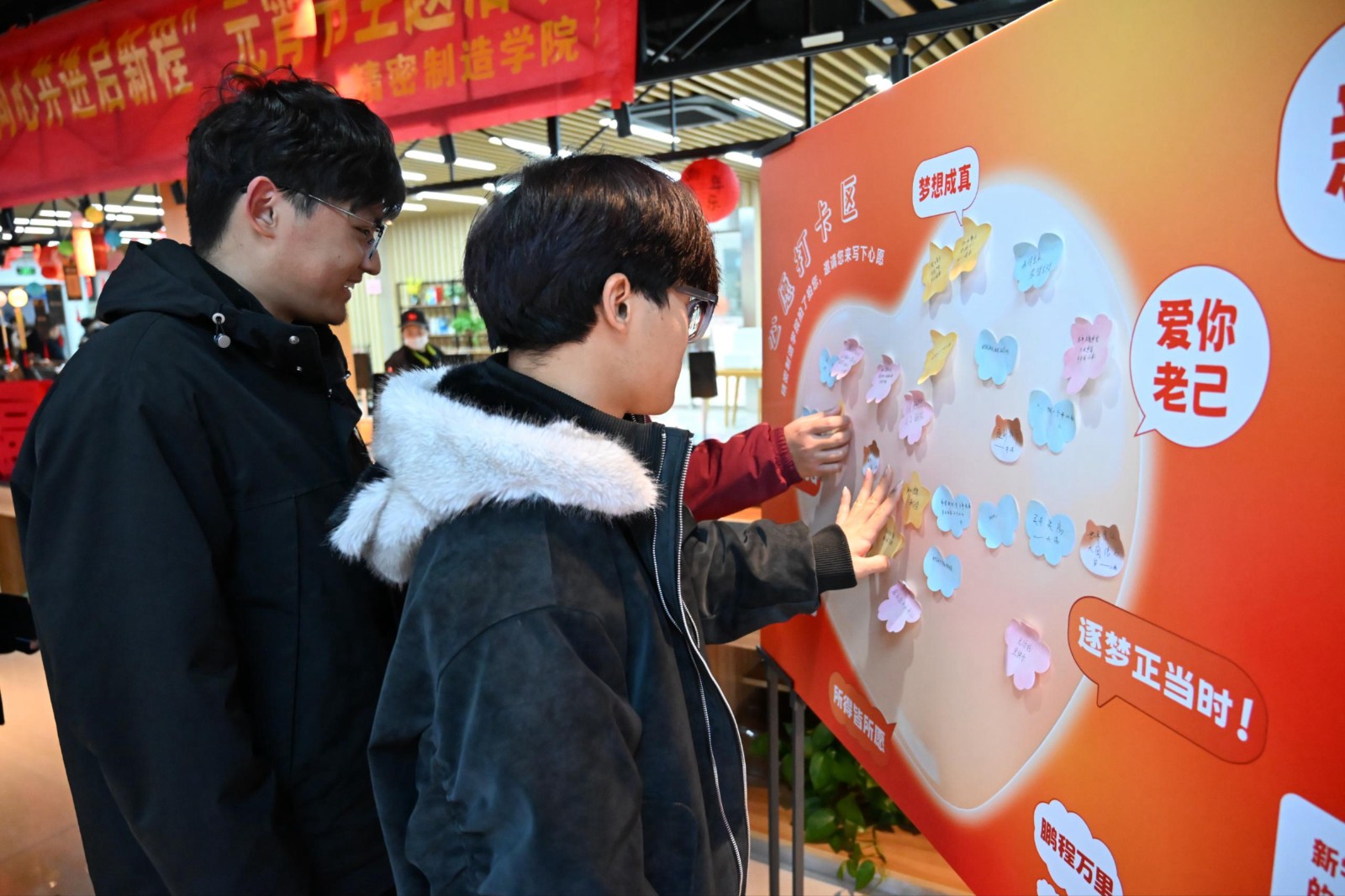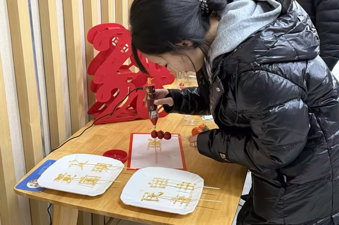 接下来的传统文化体验环节同样暖意融融。手写对联区,学生们挥毫泼墨,一个个饱满圆润的“福”字跃然纸上,传递着新春祝福;心愿墙上,五彩便签层层叠叠,既有对新学期“学业有成”的个人期许,也有祝愿“祖国繁荣”的家国情怀;糖画工坊中,师生以糖为墨,精心勾勒“爱国”“文明”等社会主义核心价值观词汇,让非遗技艺在温情互动中焕发时代光彩。