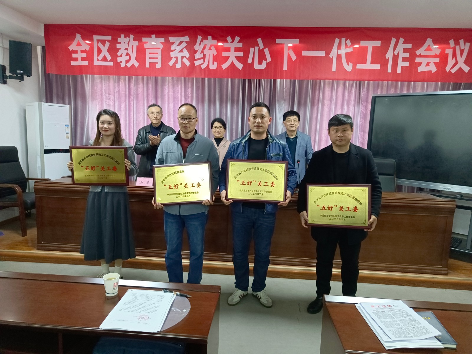区教育系统关工委副主任汤慧主持会议并宣读了中共六合区委教育工委《关于公布2025年度“关工委优质化建设均衡发展暨基层‘五好’关工委建设学校”评审结果的通知》,与会领导为4所关工委优质化建设均衡发展合格学校颁发奖牌。