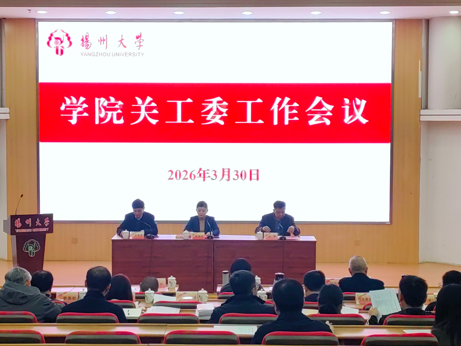 3月30日下午,扬州大学召开2026年度学院关工委工作会议。校党委副书记、校关工委副主任蔡颖蔚出席会议并讲话,校关工委常务副主任洪涛回顾总结2025年度开展的主要工作并对2026年重点工作进行动员部署,会议由校关工委副主任吴春明主持。
