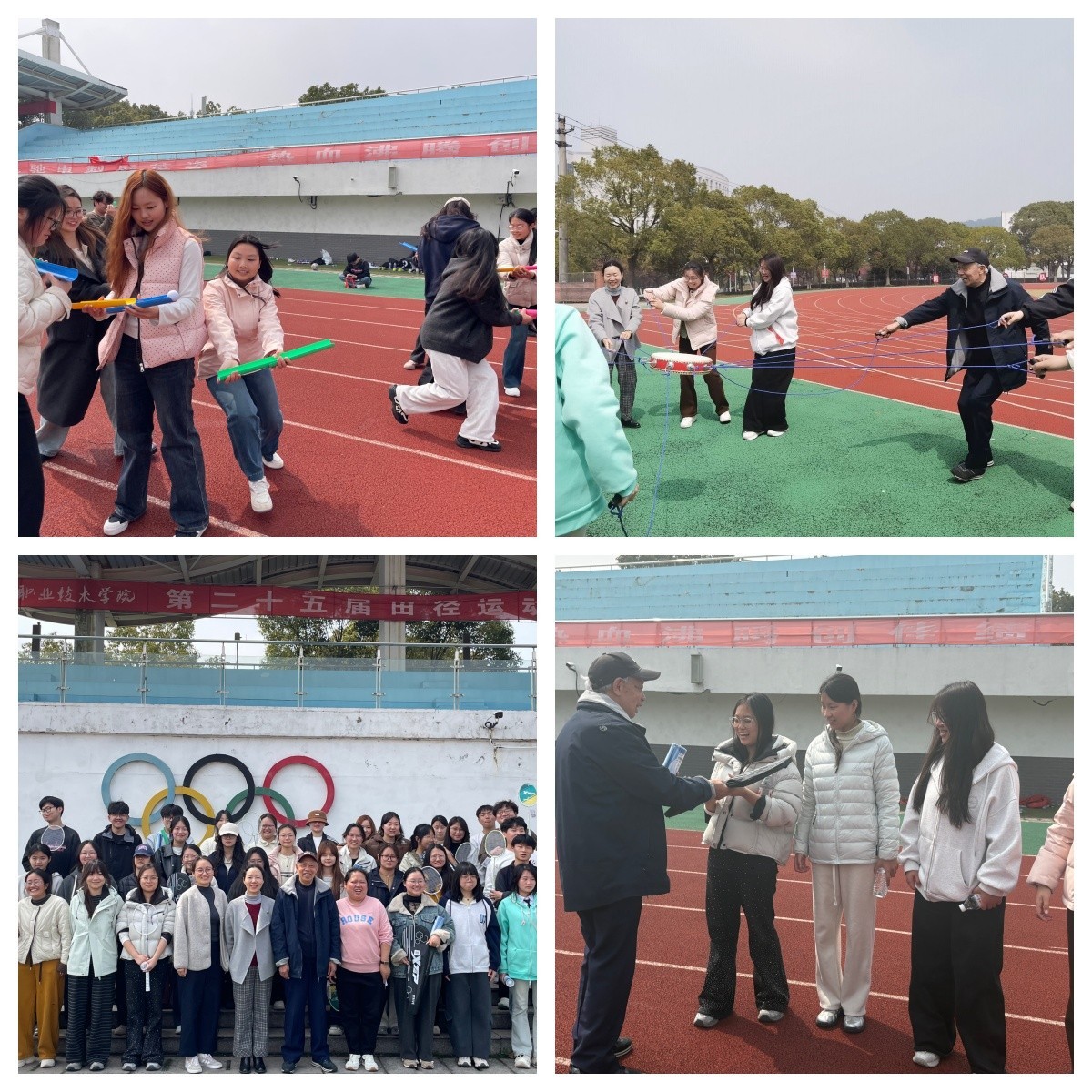活动当天,一场别开生面的学生趣味运动会在田径场举行。朱恒章老师精神矍铄地来到现场,与同学们融为一体。“四人三足”比赛中,选手们绑腿协作、奋勇向前,朱老师在一旁为他们加油助威,脸上洋溢着欣慰的笑容;“轨道传球”环节,大家小心翼翼地操控轨道,让小球顺利前行,朱老师专注观察,不时为同学们的精彩表现鼓掌;“手脚并用”项目里,选手们根据地面图案灵活调整动作,朱老师对大家的敏捷身手大加赞赏。最为热烈的是“同心鼓”环节,朱老师与同学们围成一圈,共同牵拉绳索,通过默契配合让皮球在鼓面上一次次稳稳弹起。赛场上欢声笑语不断,师生在互动中拉近了距离,也在协作中传递了信任与温暖。