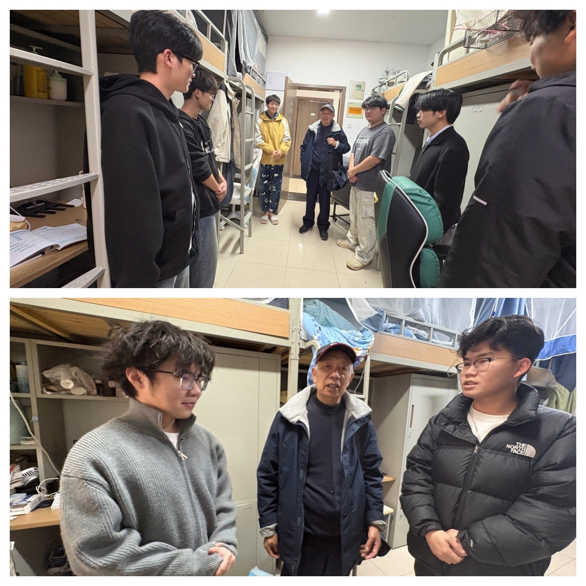 运动会结束后,在学院辅导员陪同下,朱老师走进学生社区,实地了解同学们的生活环境和思想动态,他特别关注部分存在心理困扰的学生,主动与学生促膝长谈,并结合自身多年教育工作经验,以长辈的温情和师者的智慧,耐心倾听学生的心声,循循善诱地开导他们正视困难、调节情绪,鼓励大家树立信心,学会在集体中寻求支持。朱老师朴实的话语、真诚的关怀,让同学们深受感动,纷纷表示感受到了学院的温暖和长辈的关爱。