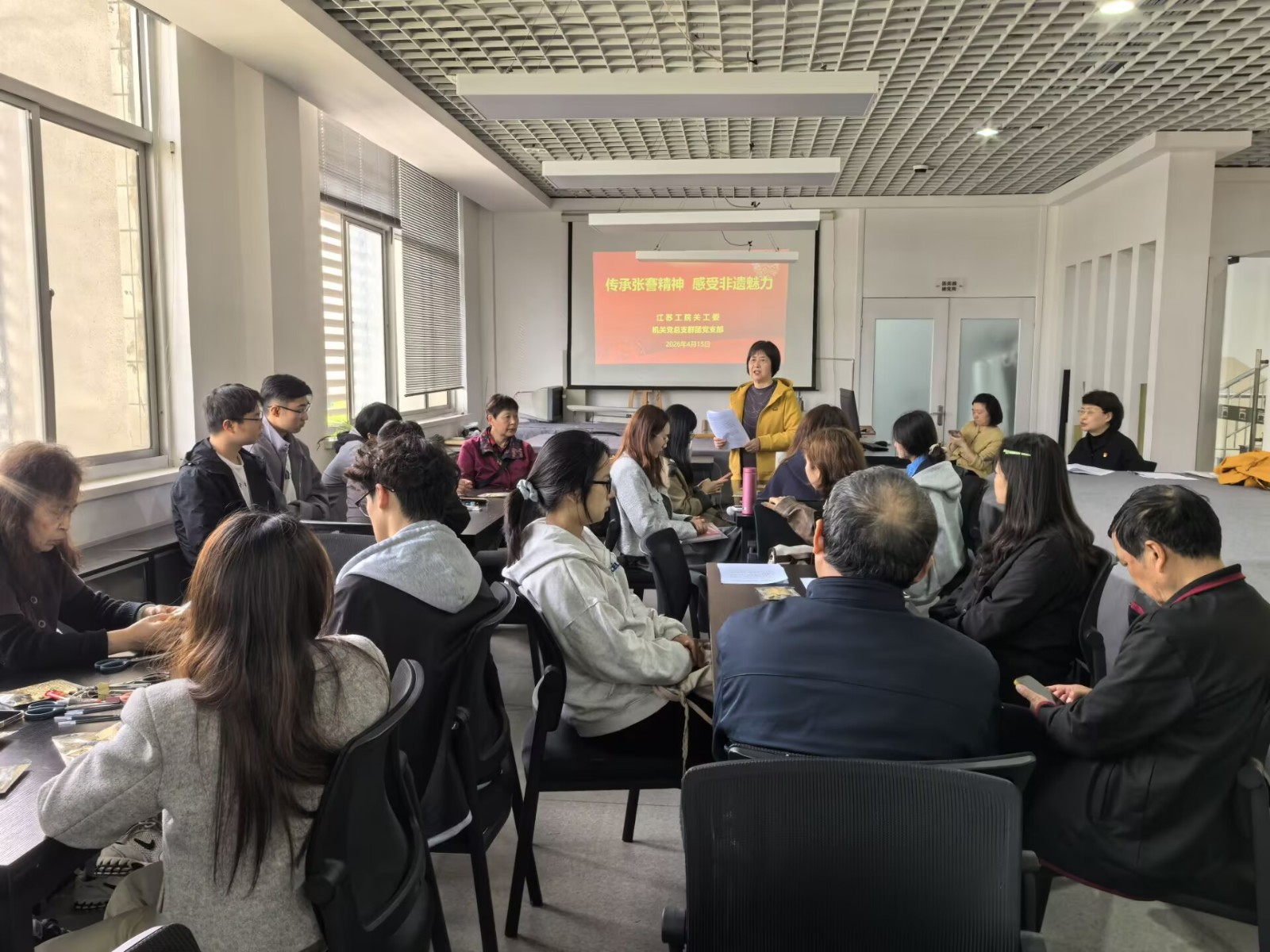 4月15日下午,江苏工程职业技术学院关工委与学校机关党总支群团党支部联合开展“传承张謇精神·感受非遗魅力”活动,十多名校关工委成员、机关党总支群团党支部党员与七个二级学院的家庭困难学生代表、少数民族学生代表参加活动,学校关工委秘书长林娟主持。