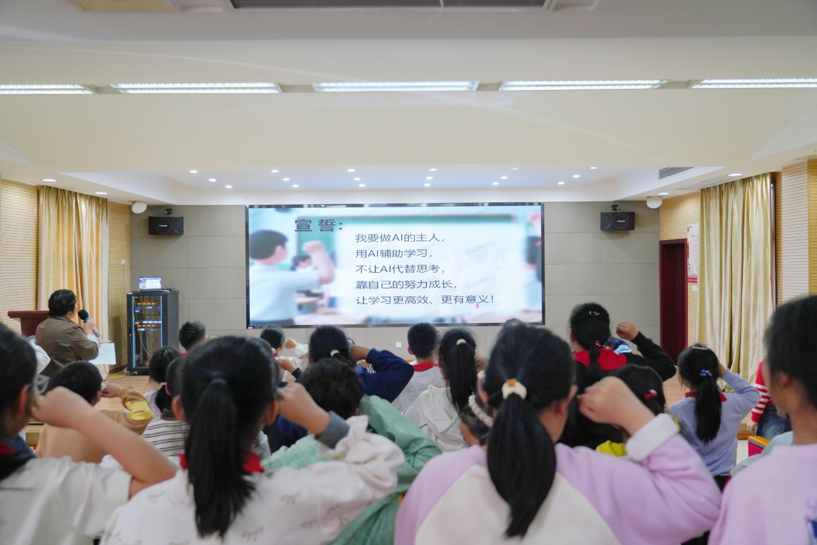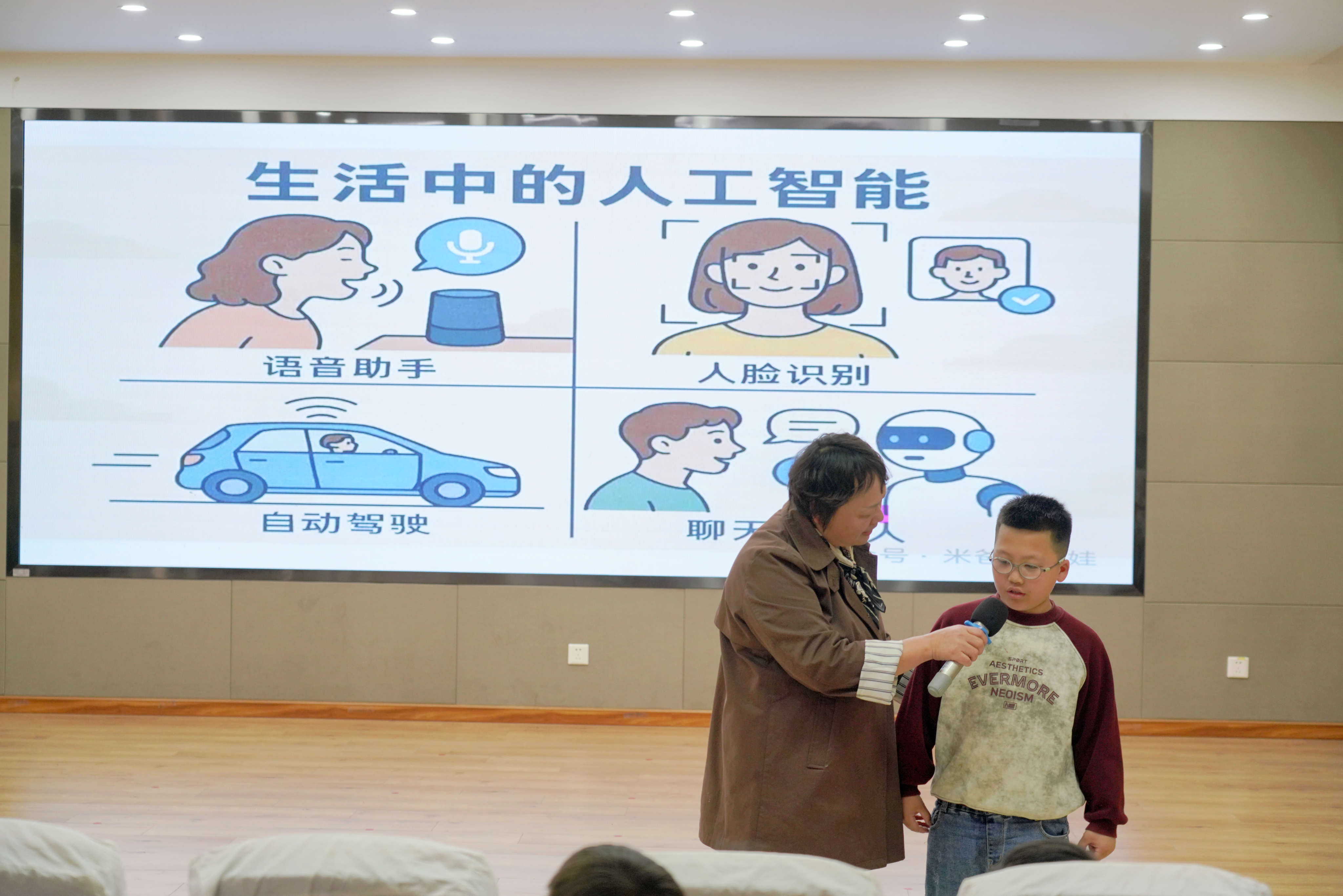 发挥“五老”优势,厚植家国情怀。学校关工委积极联动退协,邀请“五老”教师回校发挥余热,为孩子们的科创成长注入力量。三、四年级孩子们聆听了退休教师、区教育局关工委“五老”宣讲团成员黄淑颖老师带来“拥抱AI 快乐成长”宣讲。黄老师结合自身经验,用通俗易懂的语言向大家介绍AI的定义以及AI在生活、医疗、生产等领域的广泛应用,同时通过生动事例引导同学们正确看待AI——AI是辅助学习的工具,而非替代思考的捷径。她呼吁大家做AI的主人,脚踏实地学好知识,靠自身努力成长,让学习更高效。听了宣讲,孩子们心中悄然种下拥抱AI、勤于思考的种子,更在“五老”教师的言传身教中,树立起努力学习、报效祖国的远大理想。