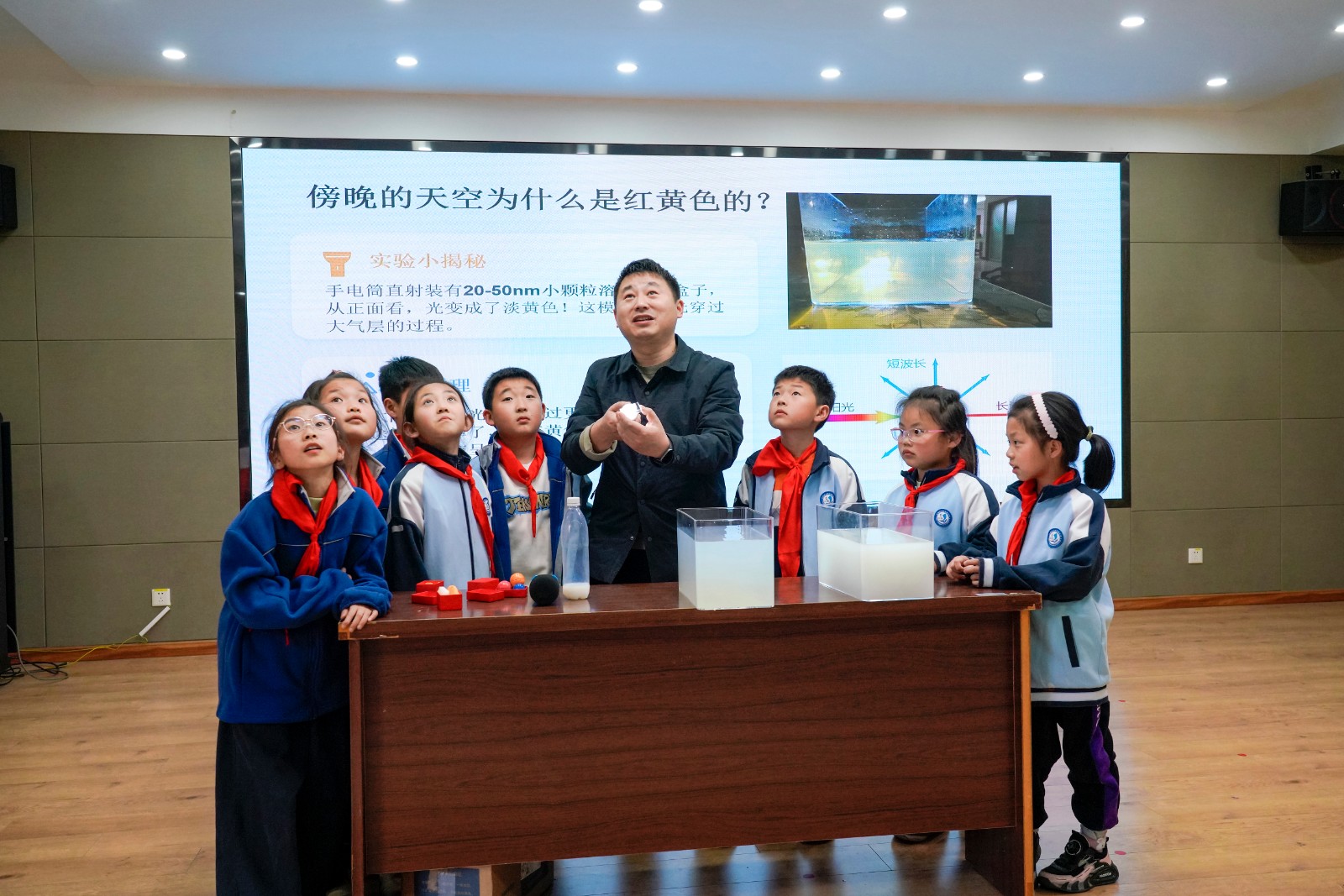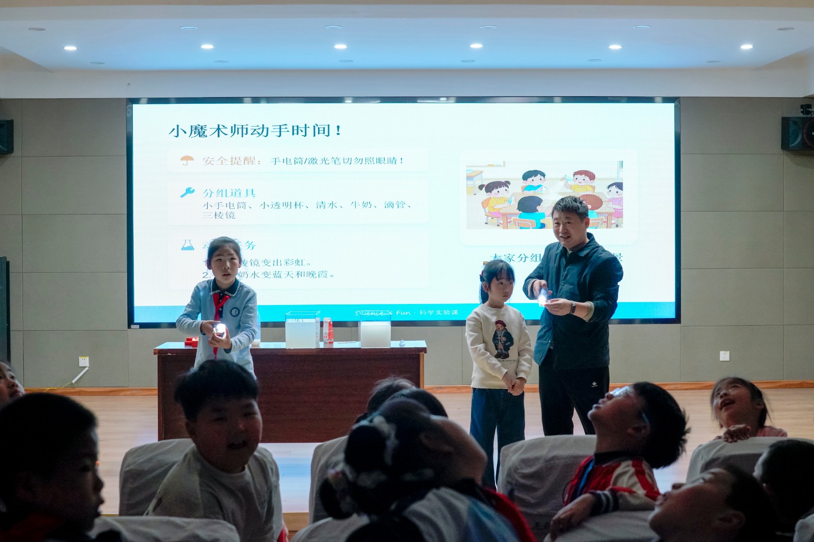家校携手,共筑科创启蒙之路。学校邀请家长志愿者郭亮老师带来一堂“光之国的魔术——解密天空的色彩”主题课堂,让一、二年级小朋友们开启一场奇妙“光学之旅”。郭老师凭借专业的知识储备和生动的讲解方式,结合趣味互动实验,带领孩子们探秘天空颜色的成因、生活中光影的奇妙变化,把抽象的光学知识变得通俗易懂。孩子们全神贯注、积极互动,在欢声笑语中收获知识、点燃好奇,也让家长的专业优势成为校园科创教育的有益补充。